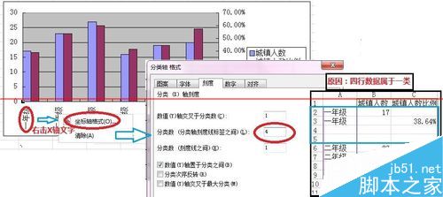 5、部分图表成图后,X轴文字显示异常,解决方法:右击→X轴文字→坐标轴格式→刻度→分类数(分类轴刻度线标签之间):4