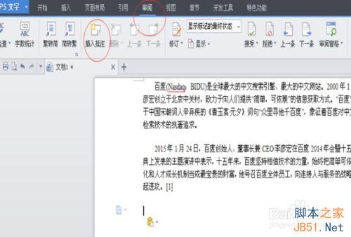 三、如果你想在文字中间插入一段话,可以直接把鼠标放置中间,然后点击批注,在批注中间插入你所想写的话。如图: