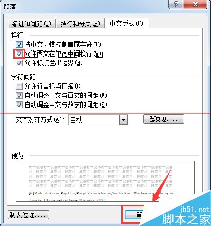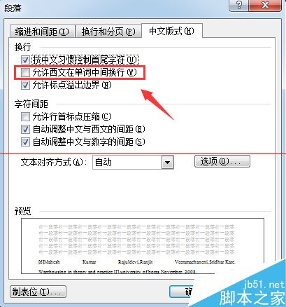 四、勾选“允许西文在单词中间换行(w)”