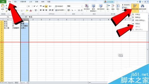 6、选中首行,按刚才的方法,选择数据——筛选,或者开始——排序和筛选——筛选,即可将首行第一行都作为筛选条件
