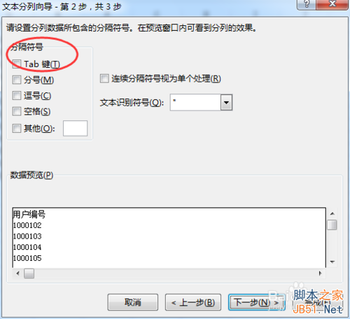 3、默认分隔符号"Tab键(T)",这里把勾选去掉。该处去掉勾选是因为不需要分隔符对这列进行列,因此不选。