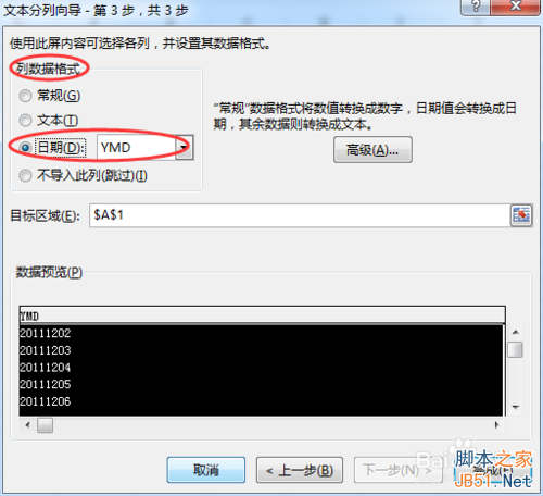 8、要注意的是,在列数据格式要选择日期(D)。