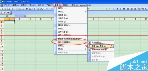 1、打开excel,在“菜单”栏中,找到“数据”,选择“导入外部数据”,然后选择“新建web查询”