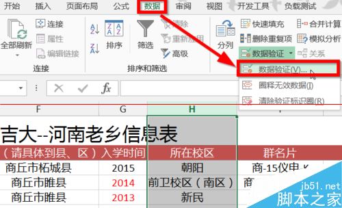 3、选择数据选项卡下面的数据验证,单击选中。