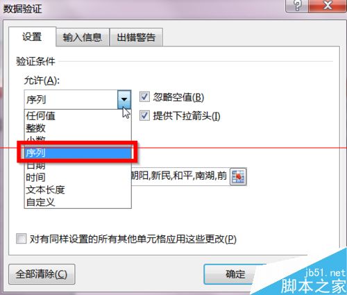 4、在弹出的窗口中你可以看到验证条件,我们选允许下面的“序列”。