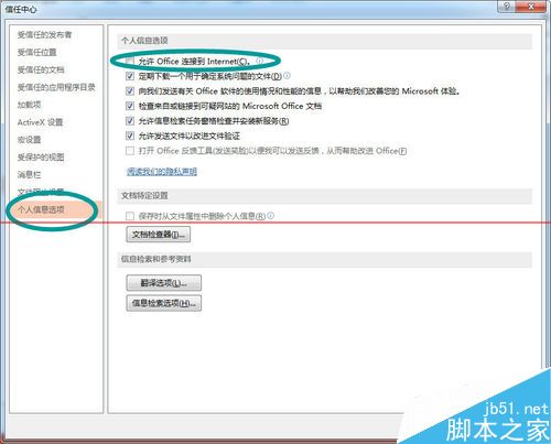 5、点击个人信息选项,取消选择“允许Office连接到Internet”,点击确定,点击确定,设置完毕。