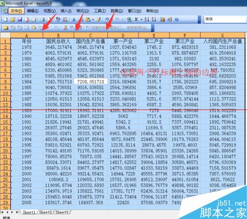 6、如果想要快速调节工作薄中所有列的列宽来适应其内容,则和上述步骤一样,全选后双击任意两列的列标题边界即可。