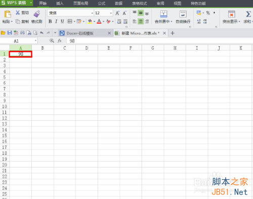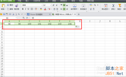 2、打开工作表后在A1任意输入一个数,选中并将鼠标放到其右下角变成黑色十字架形状,按下鼠标左键,向右拉动就会自动生成相应数,如图所示。