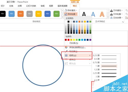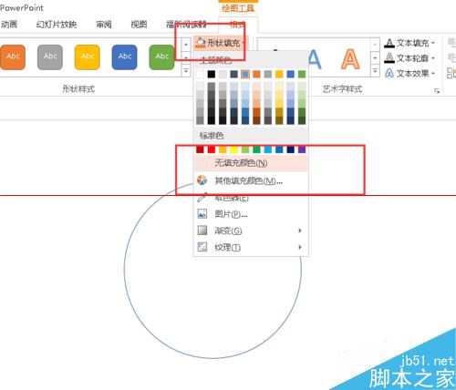 2、画好了圆之后,我们选择设置元的形状颜色和形状轮廓颜色,把轮廓变得大一些,而形状颜色变得无颜色