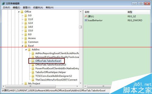 3、进入Office节下的Excel,删除其中的OfficeTab.TabsforExcel
