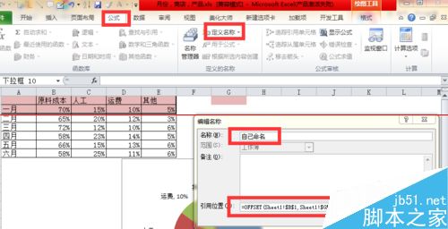 3、图表设置完后,点击【公式】,【定义名称】。名称可根据自己的喜好命名。如:”自己命名“,在引用的位置处输入:=OFFSET(Sheet1!$B$1,Sheet1!$G$1,0,1,4)。确认及可。注意:G1是任意选取的,要记住此单元格,下面要用到。注意:命名也要记住