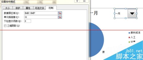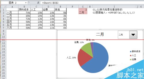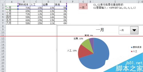 6、点击【确定】设置完后,我们可以通过点击控件的月份得到当月的图表,不过标题始终显示为”一月“。现在就对标题进行调整:首先可以发现G1里面出现数字,且随着下拉菜单的月份进行变化。如:六月显示6。在G1附近,我选择G2,输入公式:=OFFSET(A1,G1,0,1,1) 按enter键就会出现和G1数字对应的月份。然后点中图表中的【一月】,在公式栏输入:=Sheet1!$G$2。按enter键后,就全部完成。