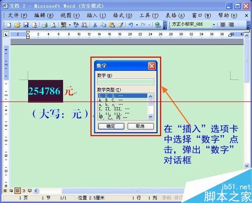 第三步:在“插入”选项卡中选择“数字”点击,弹出“数字”对话框。