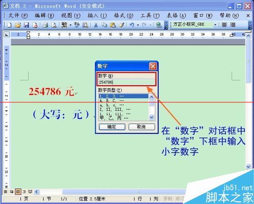 第四步:在“数字”对话框中“数字”下框中输入小字数字。