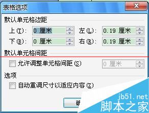 2、表格属性-选项,在表格选项窗口中查看默认单元格边距 下:如图,默认下边距是0厘米,可以改成0.01或其它非0值,建议选0.01,对表格高度影响最小。