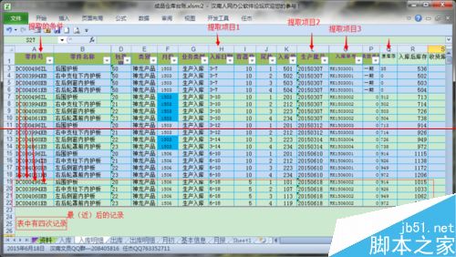 2、列出提取条件及项目:在sheet1中,将A列放置提取条件(即零件号)。在B、C、D、E列分别写上提取项目名称:入库日期、入库单号、最后生产批号、入库前库存数