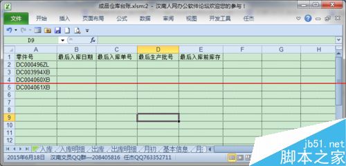 1、分析数据表:通过浏览“入库明细”表,我们可能看到入库明细表中,作为提取记录的条件零件号在A列;需要提取的记录,入库日期在H列、入库单号在O列、最后生产批号在L列、入库前库存数在Q列。为DC000496ZL的记录有5条(截图中的4条是指上面有4条)。