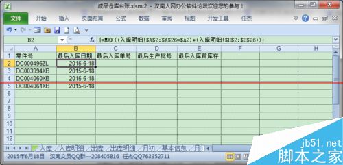 3、写公式:在最后入库日期项目下B2中输入公式:=MAX((入库明细!$A$2:$A$26=$A2)*(入库明细!$H$2:$H$26)),这是一个数组公式,请用三键确认(ctrl+shift+enter)。