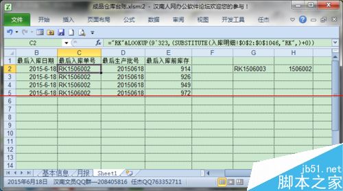 4、在最后入库单号项目下C2中输入公式="RK"&LOOKUP(9^323,(SUBSTITUTE(入库明细!$O$2:$O$1046,"RK",)+0)),(因为单号是文本类型,并且单号的前缀都是RK)。