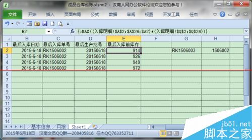6、在最后入库前库存项目下E2中输入公式=MAX((入库明细!$A$2:$A$26=$A2)*(入库明细!$Q$2:$Q$26)),这也是一个数组公式,请用三键确认(ctrl+shift+enter)。