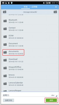 我们正在积极与Google方面沟通,将在三月份发布的WPS Office 6.0中解决这个问题。在WPS Office 6.0版发布之前,您可以参照如下方法,通过将文档另存至内置存储器(sdcard0)来满足日常使用。