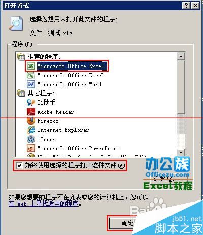 3、此时弹出“打开方式”选择“Microsoft Office Excel”如图红框所示。再选择“始终使用选择的程序打开这种文件”接着按“确定”即可。