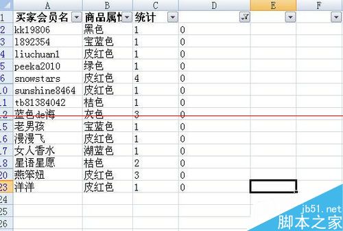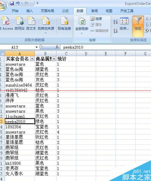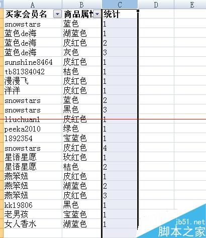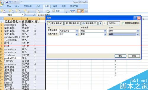 3、鼠标点击 菜单栏“排序”,在弹出的对话框中,【主要关键字】选择【买家会员名】,点击【添加条件】,【次要关键字】选择【统计】,【次序】处选择【降序】,【确定】,结果如图所示。此处需要注意【次要关键字】处,一定要选择【降序】。