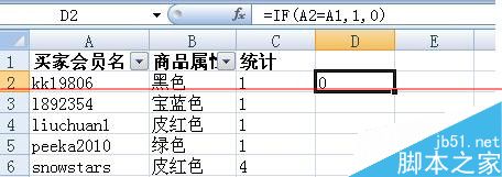 4、此步骤是获取买家最后出现的记录,如图,在d列输入公式“=IF(A2=A1,1,0)”,判断第一条记录出现,结果如图,并拖动句柄,获得全部数据。