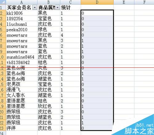 5、筛选 【d 】列数据为“0”的数据,得到的即为所要的结果。