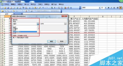 5、此时,会弹出一个“自定义自动筛选方式”的对话框,根据自己需要填写内容,如小编想要筛选出年份为1978年的GDP数据,就选择年份“等于”——“1978”,如果想选择1978年后的,可选择“大于”