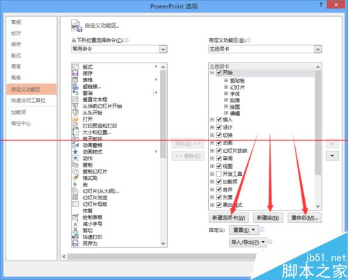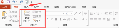 5、按照PowerPoint的定义 ,下图箭头所示的开始、插入等为选项卡,红色方框区域内为组。