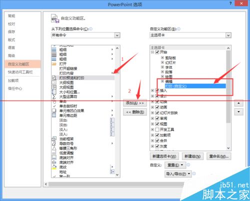 7、选中左侧的【打印和预览】按钮,将其添加到右侧的【打印】组内,如下图