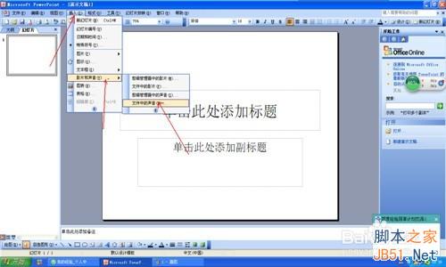 2、在菜单栏中,单击插入,找到影片和声音,单击来自文件中的声音。