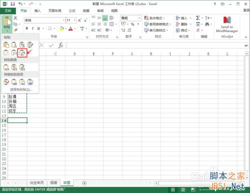 3、在菜单栏中选择“粘贴”快捷按钮,粘贴方式选择“转置”,如下图。