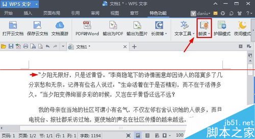 5、现在我们将鼠标点到文章的开头,然后点击特色功能中的朗读按钮,这样就开始朗读文章了。