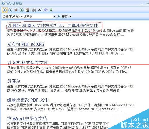 2、在弹出的word帮助菜单中,搜索”另存为pdf或xps加载项“,得出如图所示的结果,图中的第一个选项正是我们需要的。点击它。