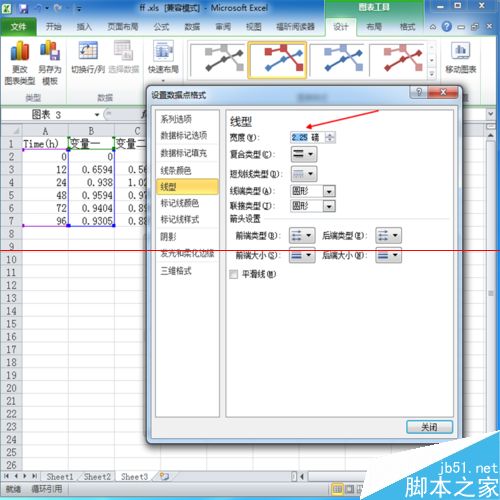 步骤五:如果想改变线条的粗细,同样,双击数据线,出现跟之前选次坐标轴一样的的窗口,点击线型,然后在箭头所示的地方可以更改线条粗细。