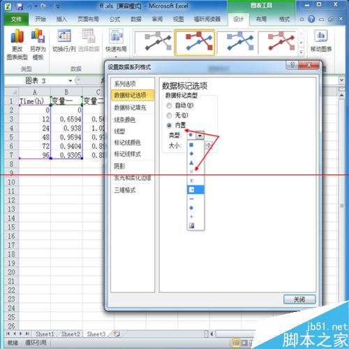 步骤六:如果觉得标记点难看的话,也可以改,同上,双击数据线。点击数据标记选项。点击内置,选择你喜欢的标记类型及大小。