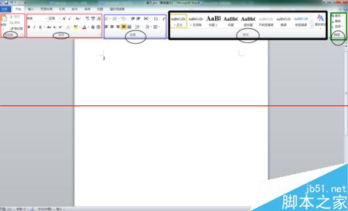 1、打开word2010,可以看到五大区域,即剪贴板、字体、段落、样式和编辑。
