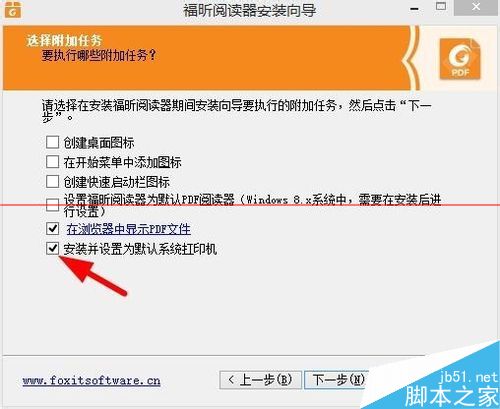 2.安装,安装向导出现以下选择时,点 安装并设置为系统默认打印机;其他的选项可以自行选择。