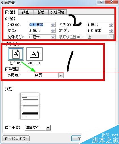 3、根据文件的方向选择“纸张方向”,一般默认即可;页码范围选择“拼页”。根据文档的具体情况适当调整页边距,使两截尽量居中。
