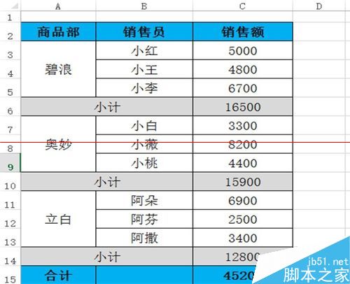 1、根据销售情况,先制作一个分商品部、分员工的销售表,如下图所示。