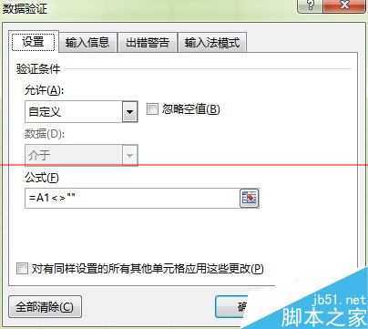 3、验证条件选“自定义”,填写 =A1<>"" 把右边的忽略空值去掉勾。意思就是说填写C5的条件是A1这个单元格不等于空值,要有内容。<>就是不等于号,而引号里什么都没有。