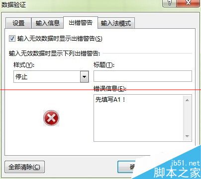 4、切换到出错警告,填写说明。最后确定。