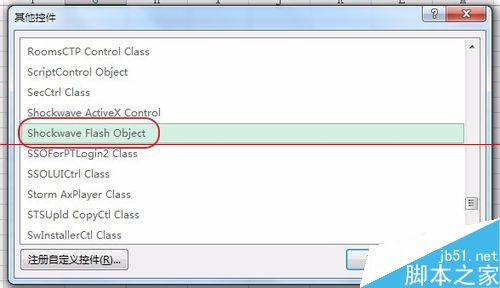 2、单击“开发工具”——插入——其它控件,单击打开对话框,在对话框中选择“Shockwave Flash Object”,单击确定,拖住十字光标,画出一个矩形。