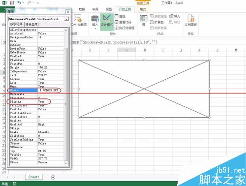 3、右键矩形框选择“属性”,打开属性对话框,在“Movie”右侧填入时钟的地址与名称(如 F:\CLOCK.SWF ),将Playing设置成TRUE,关闭属性对话框.