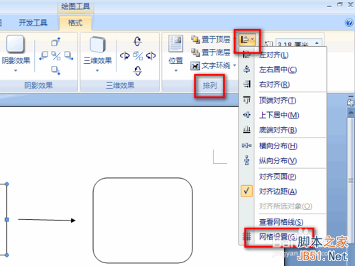 2、点击“排列”功能中的“对齐”选项,在弹出的菜单中进入“网格设置”。我们要进行的就是对齐图形,所以要到“对齐”选项中找设置。
