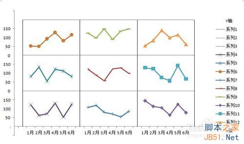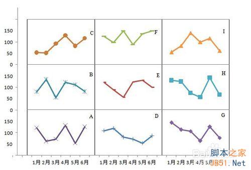 九宫拆线图,即为九个图分别放在九个小格中,使各图分开显示,无重叠,更直观。本文教大家用excel制作九宫拆线图,步骤虽然简单,但需要耐心。九宫拆线图效果如下。