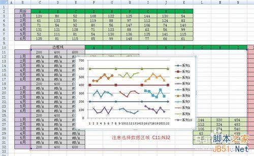 2、选择数据区域C11:N32,插入带数据标记的拆线图。数据区域一定不要选错,否则不利于后续坐标刻度的修改。