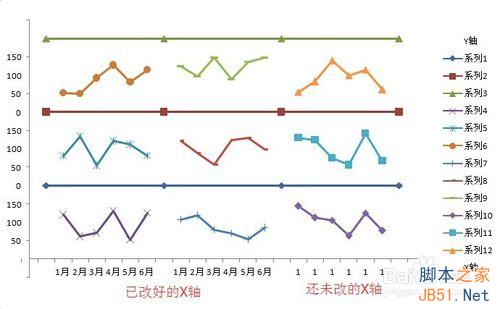 右键绘图区域,选择数据--添加--系列名称填入“X轴”,系列值选择O11:O23区域。